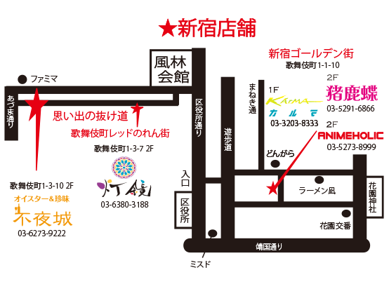 | Bar アニメホリック ANIMEHOLIC | 東京都 新宿区 歌舞伎町(ゴールデン街)1-1-10 2F | 03-5273-8999 |